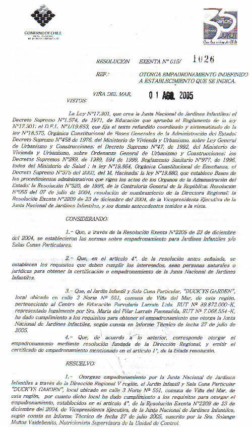 Jardín Infantil DUCKY`S GARDEN fué creado el 30 de Mayo de 1982, con el fin de entregar a los niños y niñas nuevas experiencias a través de proyectos y estimulaciones que le permitan desarrollarse en forma integral y en un ambiente seguro y afectivo.